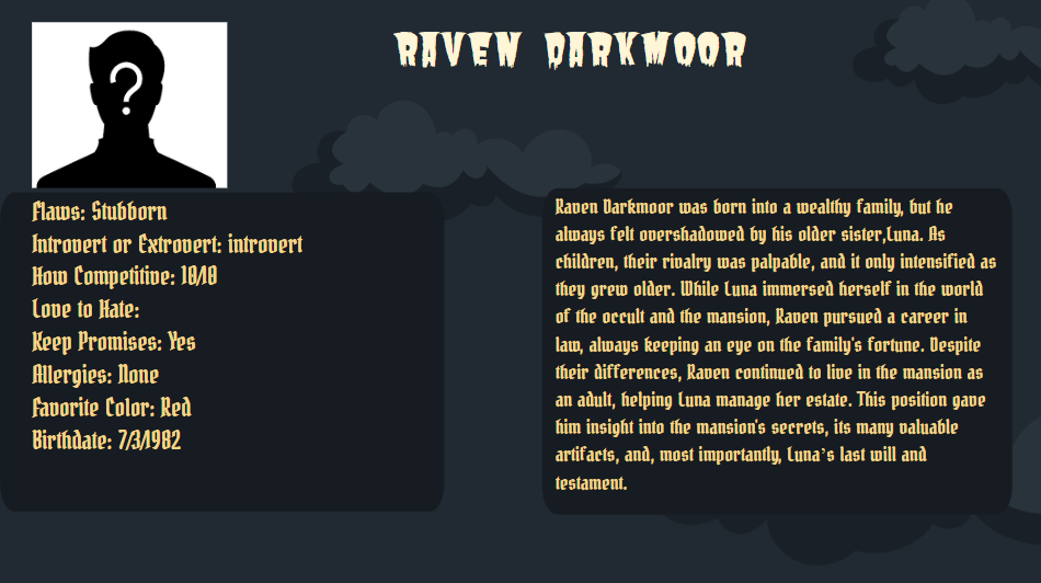 I encourage you to get very creative at this point in the game. This is where I hide information that should help the team solve the mystery. I do this by peppering information like the characters’ idols, birthday, middle name, habits, pet peeves, relation to other characters, favorite snack/food, or anything really. The options are endless here so go wild!