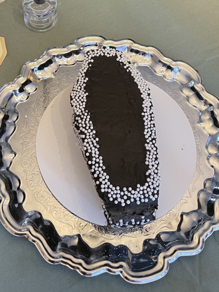 Homemade Coffin shaped cake with chocolate buttercream icing and strawberry cake