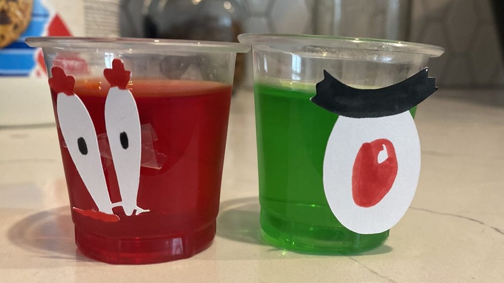 - Plankton Jello Shooters & Mr. Krabs Jello Shooters – Green and Red Jello with DIY eye decals using markers and my Cricut